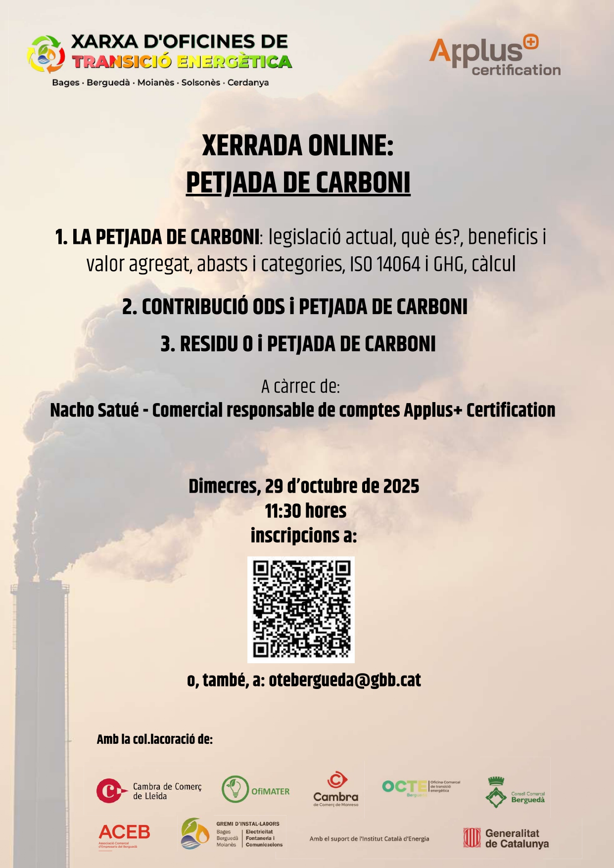 El pròxim dimecres 29 d'octubre a les 11:30 tindrà lloc aquesta jornada online on parlarem sobre la petjada de carboni, una representació numèrica de la sostenibilitat de les empreses i els seus processos. Algunes empreses (les més grans) ja estan obligades a calcular la seva petjada de carboni, però també aquelles petites que formen part del procés productiu de les grans a les que aplica ja que aquestes estàn obligades a tenir el càlcul de tots els seus proveïdors.