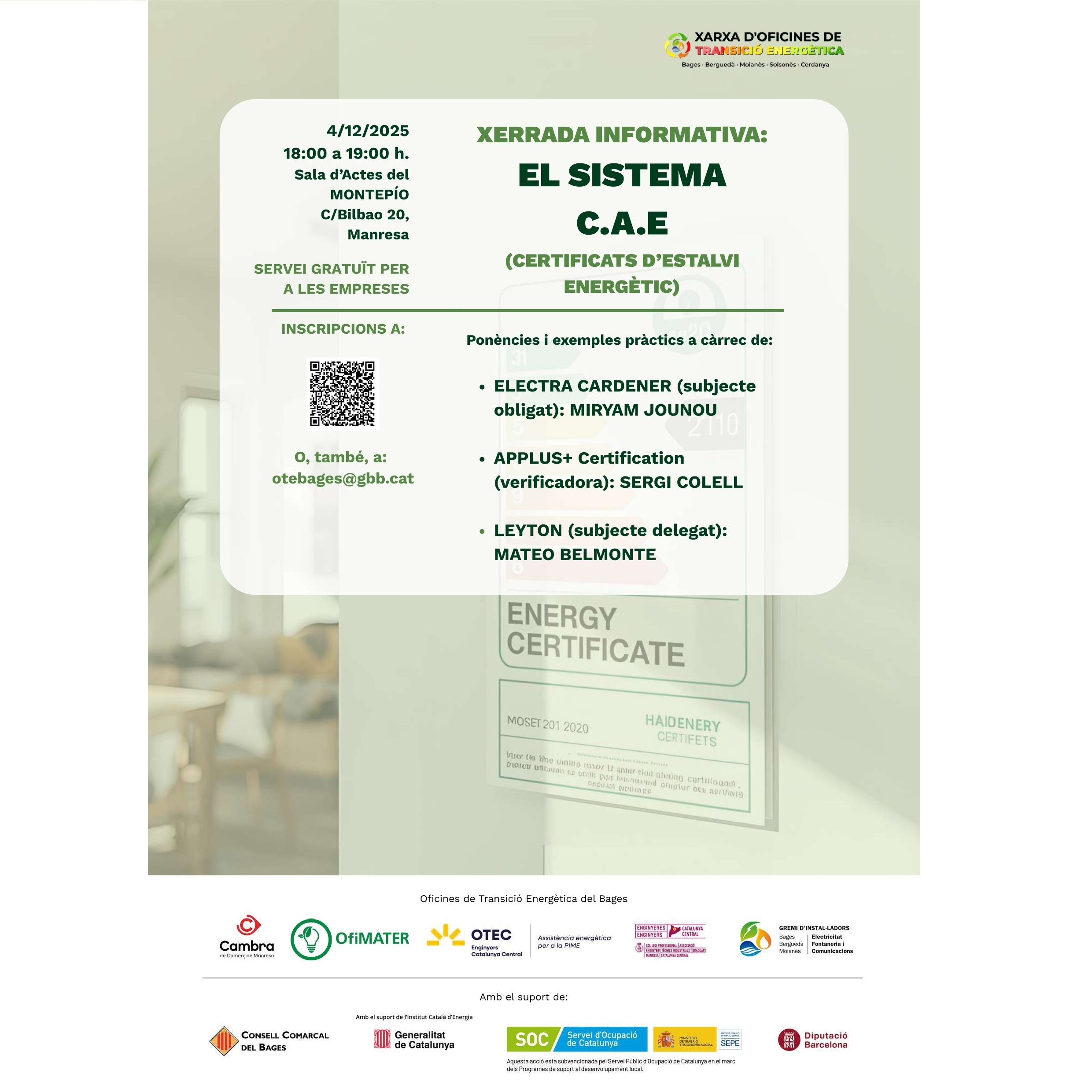 Per a més informació i/o assessorament personalitzat sobre els CAEs, t'esperem a la jornada o a les Oficines de Transició Energètica del Gremi d'Instal·ladors (otebages@gbb.cat, 938748048)