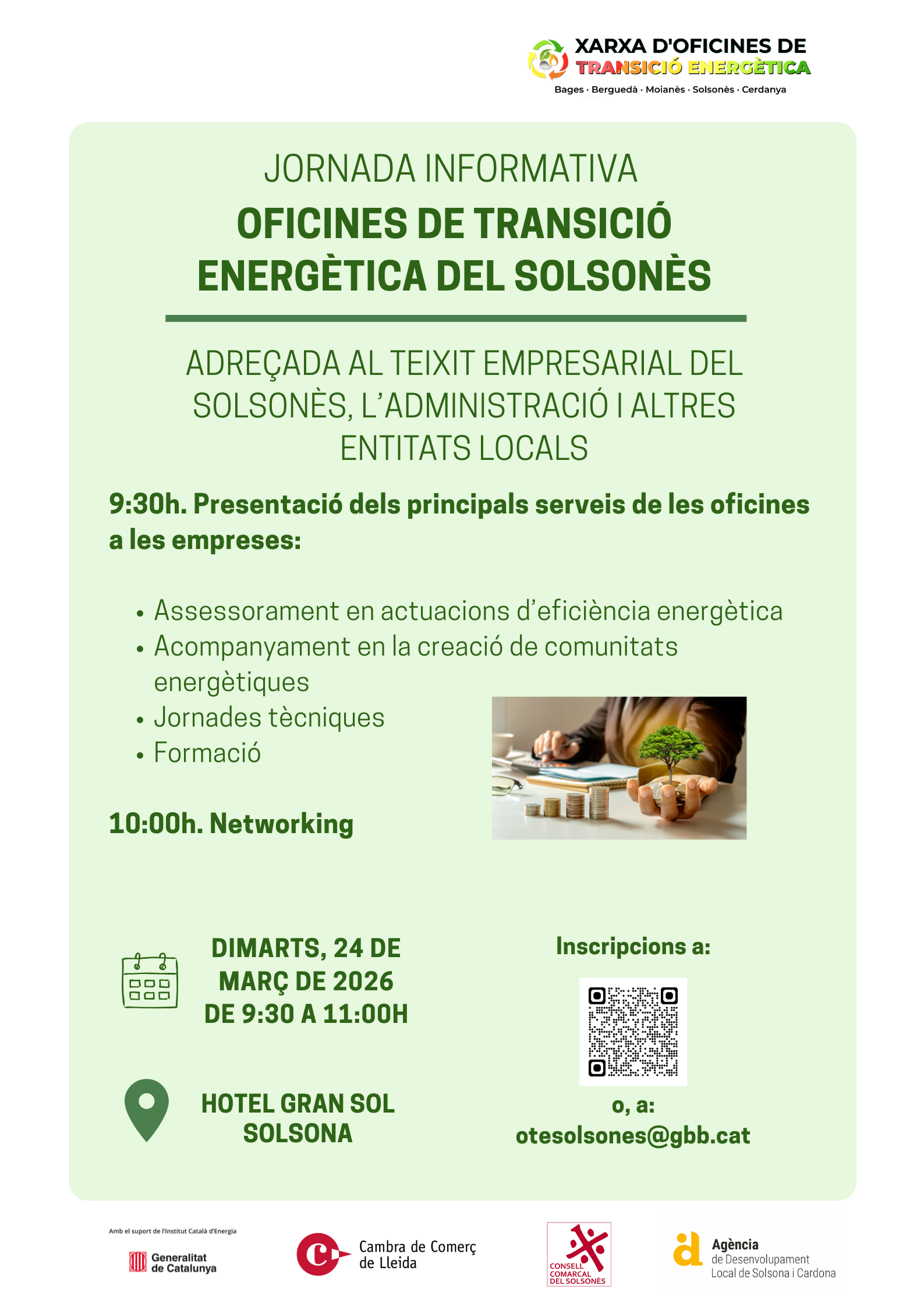 El pròxim dimarts 24 de març de 2026, de 9.30 a 11.00 h, tindrà lloc a l’Hotel Gran Sol de Solsona una jornada informativa adreçada al teixit empresarial del Solsonès, a l’administració pública i a altres entitats locals per donar a conèixer els serveis de les Oficines de Transició Energètica del Solsonès.